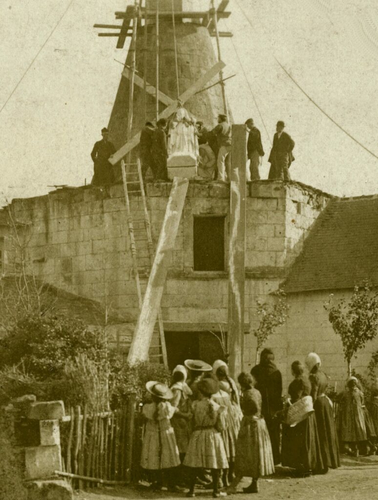 Le Moulin de la Vierge fut construit en 1839 par M. Chauveau-Doublard sur la parcelle du Pignon Blanc. C’est un moulin pivot surélevé par un rez-de-chaussée et un étage pour mieux prendre le vent d’ouest dominant